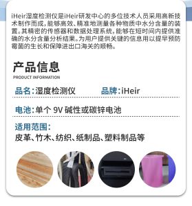 3. 多材质适用:可测木材、竹制品、皮革、纺织品、纸张、棉花、工艺品等多种材料含水率。